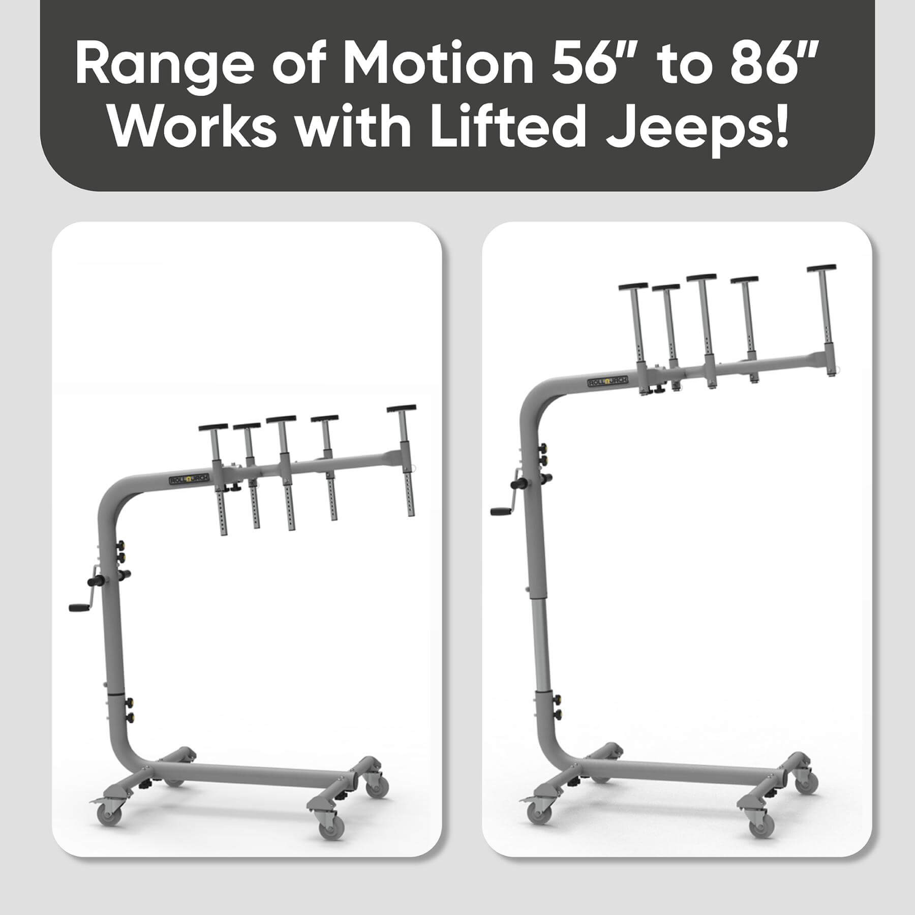 Fully Adjustable for stock Jeeps to accommodate virtually any lifted Jeep on the market. Adjustable height 56 inches to 86 inches.