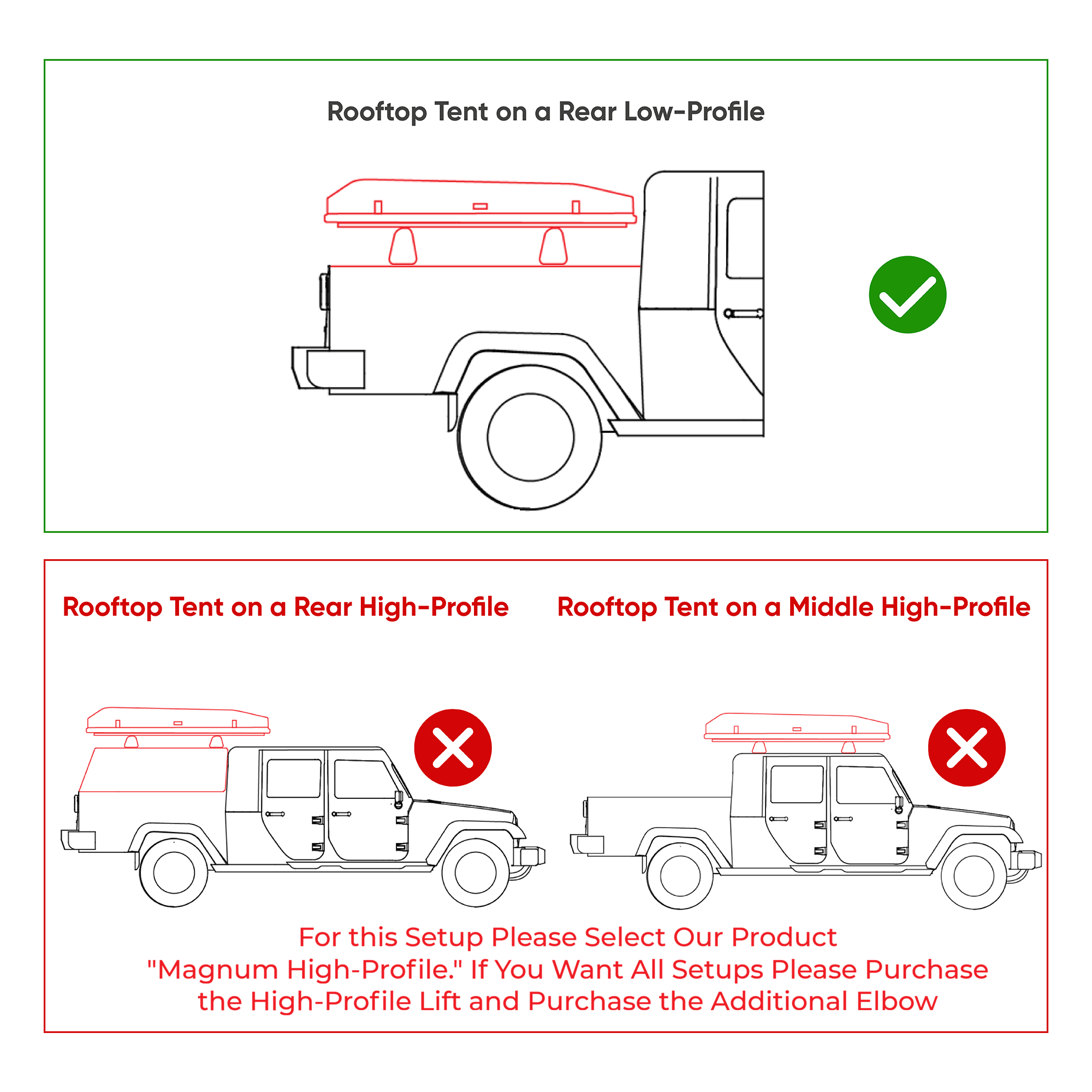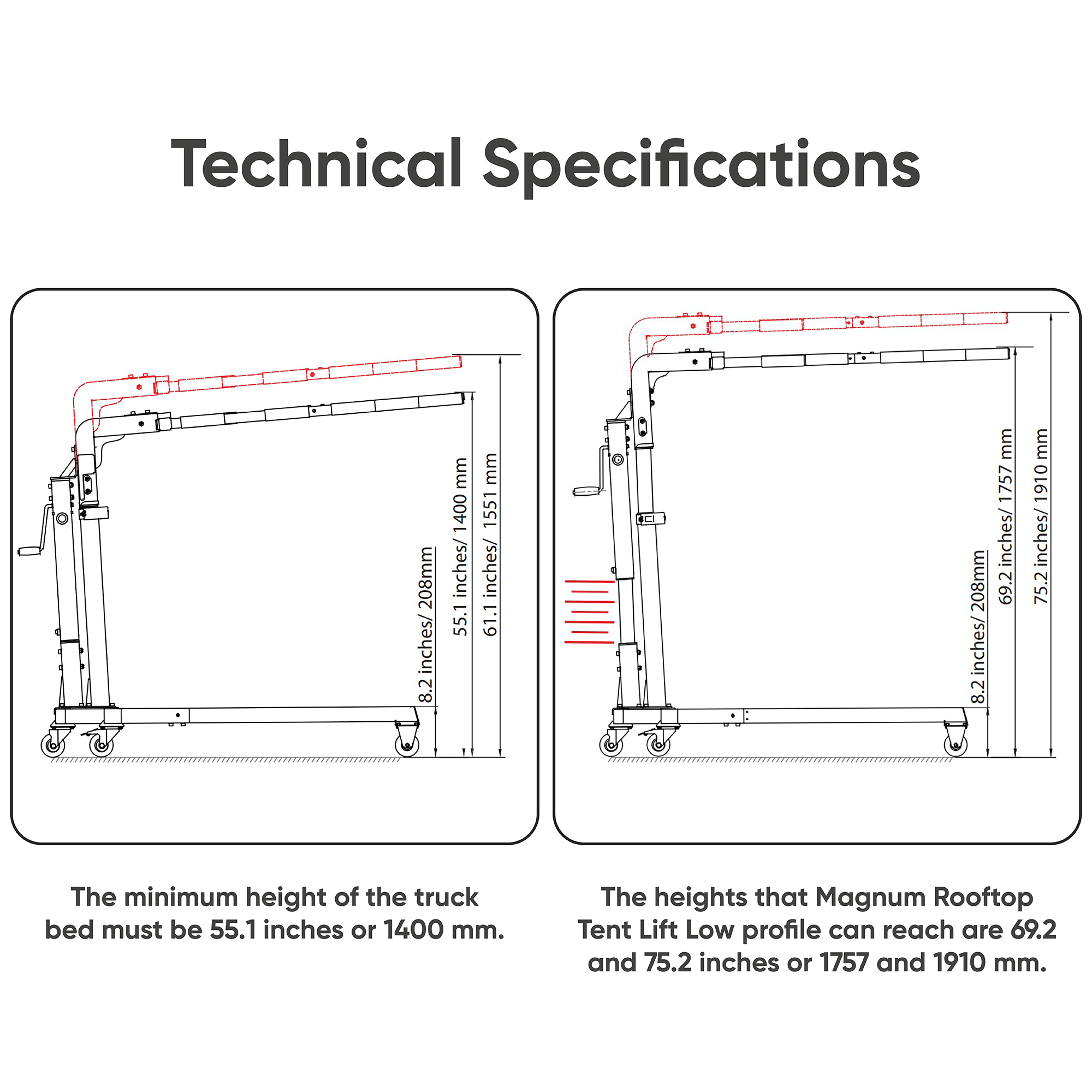 The Magnum Lift is the newest product for rooftop tent removal, installation, and storage. The Magnum is for trucks. This is the “Low-Profile” Version. Please see the pictures for height reference. For rooftop tent removal for cars and SUVs please see our other product: The "Bad Boy."